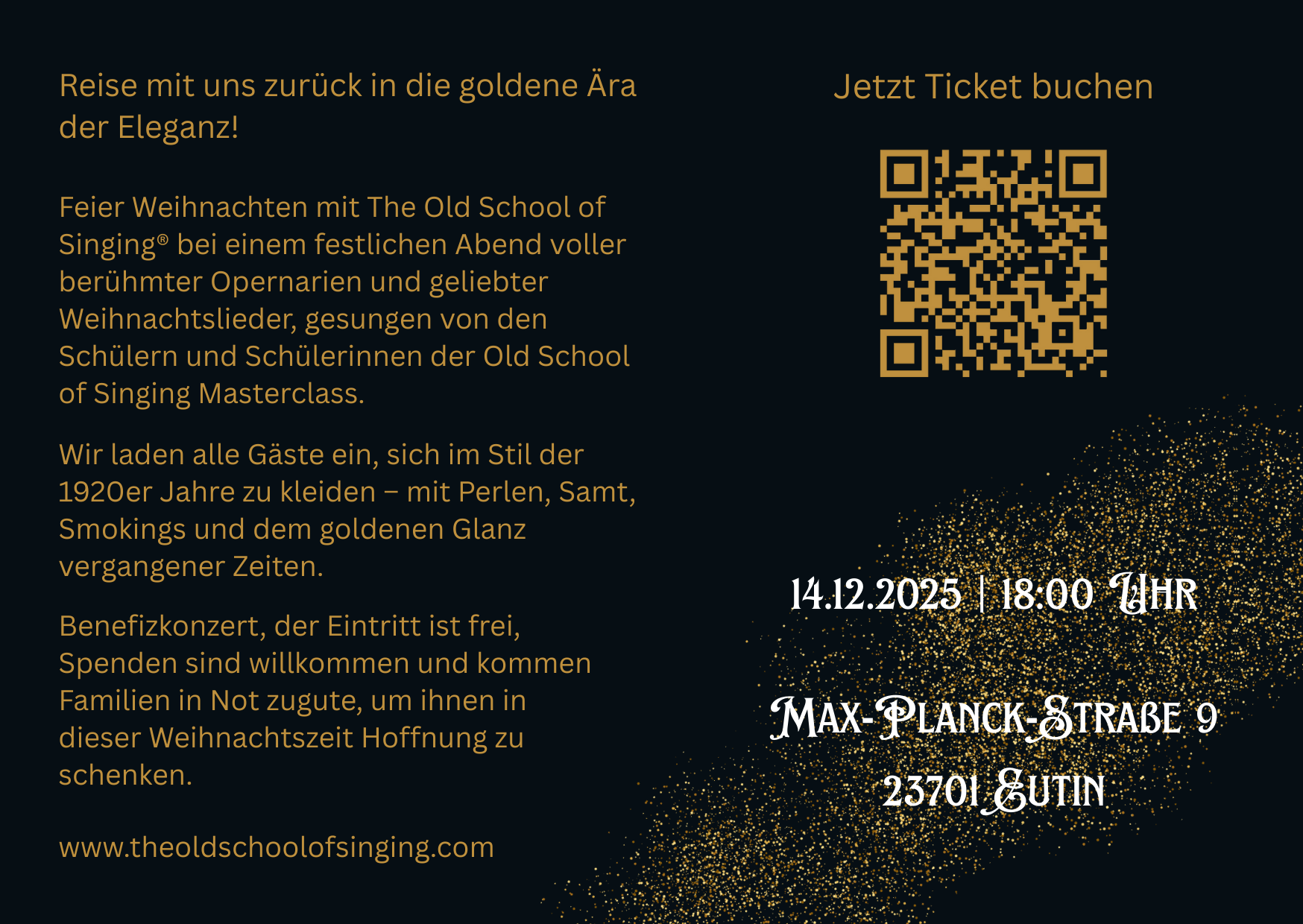 Stepping into this evening means stepping back in time. The dress code evokes the elegance of the 1920s Golden Era, inviting the audience into a world of refined beauty, classic attire, and the intimate charm of a bygone time. Within this atmosphere, the concert brings together opera arias and traditional Christmas carols, performed according to the authentic principles of the Old School of Singing®.